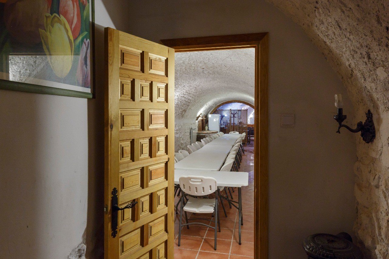 Bajo la pérgola exterior discurre una antigua bodega centenaria, renovada recientemente, con una extensión de 25 m x 3m, con espacio suficiente para distintos tipos de eventos: celebraciones, bodas, encuentros, retiros, cursos, talleres, etc.