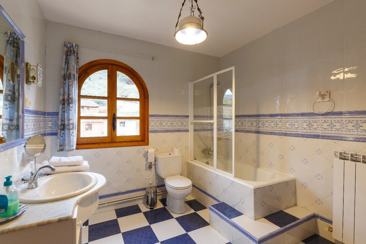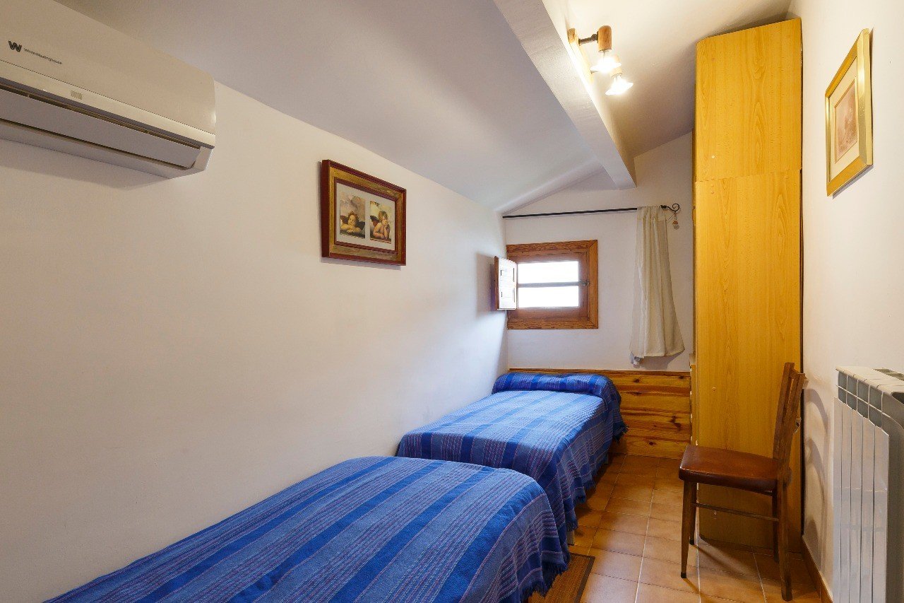 En la segunda planta se encuentran 2 habitaciones abuhardilladas, una con cama de matrimonio y otra con dos camas individuales de 80 y el solanar con buenas vistas al pueblo y al valle.