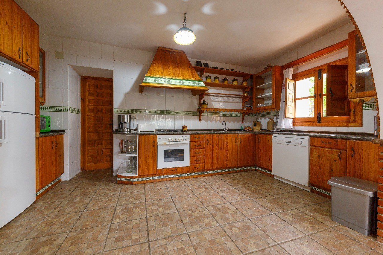 En la planta baja está el patio con acceso a las principales habitaciones de la casa. A su derecha está el comedor, cocina, despensa y cuarto de lavar. A la izquierda se sitúa un gran salón (50 m2) con chimenea y dos sofás-cama, ubicándose a continuación al fondo un baño de 10 m2. Desde el patio, la escalera de la izquierda nos conduce a las plantas superiores. Al fondo del patio tenemos también acceso directo al garaje
