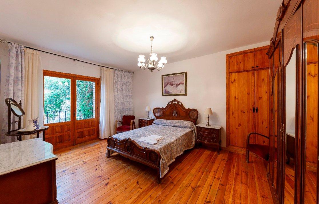 La primera planta consta de 3 dormitorios (de 20, 13 y 11 m2 respectivamente) con 4 camas (dos de matrimonio y dos individuales), y un segundo baño. Por una escalera de caracol puede ascenderse a la 2ª planta.